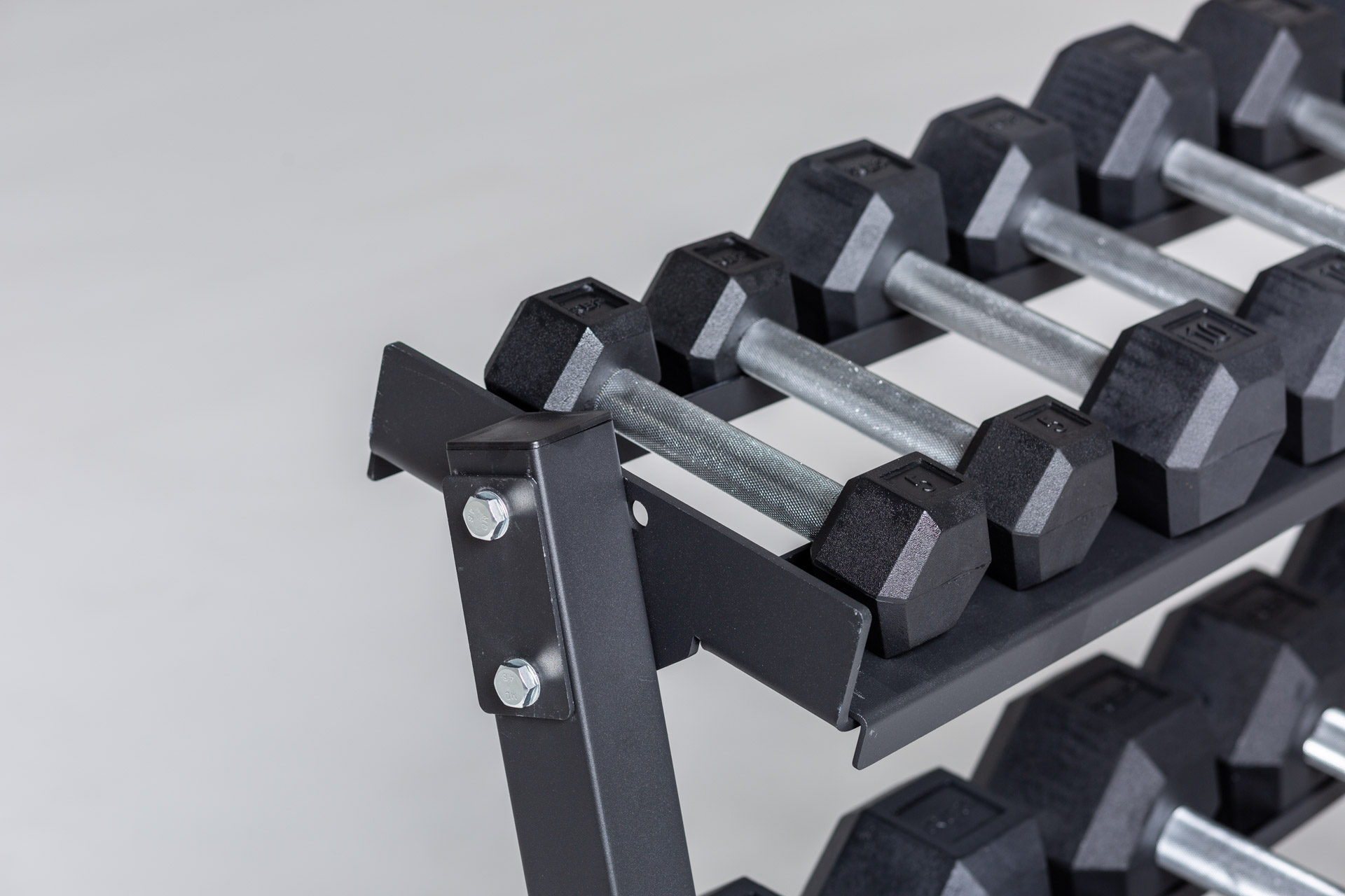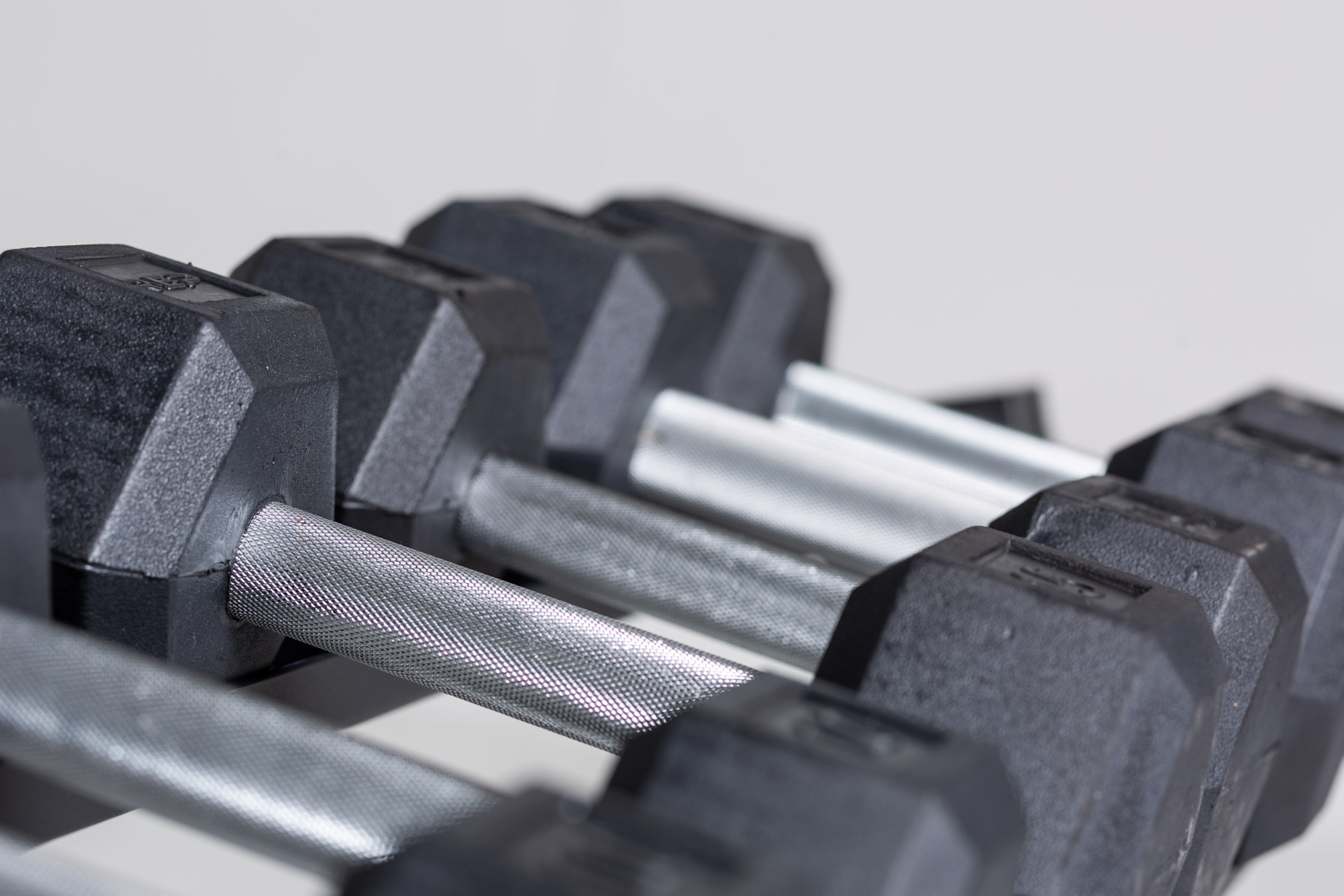 • עיצוב משושה חכם: המבנה המשושה מונע מהמשקולות להתגלגל על הרצפה, מה שמאפשר אימון בטוח יותר ושימוש נוח בתרגילים כמו שכיבות סמיכה על משקולות (Renegade Rows).